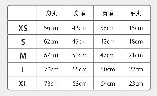 サイズ | 【S】 身丈62 身幅46 肩幅42 袖丈18cm 推奨身長:158〜168cm 【M】 身丈67 身幅51 肩幅47 袖丈21cm 推奨身長:165〜175cm 【L】 身丈70 身幅55 肩幅50 袖丈22cm 推奨身長:172〜182cm 【XL】身丈73 身幅58 肩幅54 袖丈23cm 推奨身長:179〜189cm ※サイズ表記はメンズサイズの表記になっています。 |